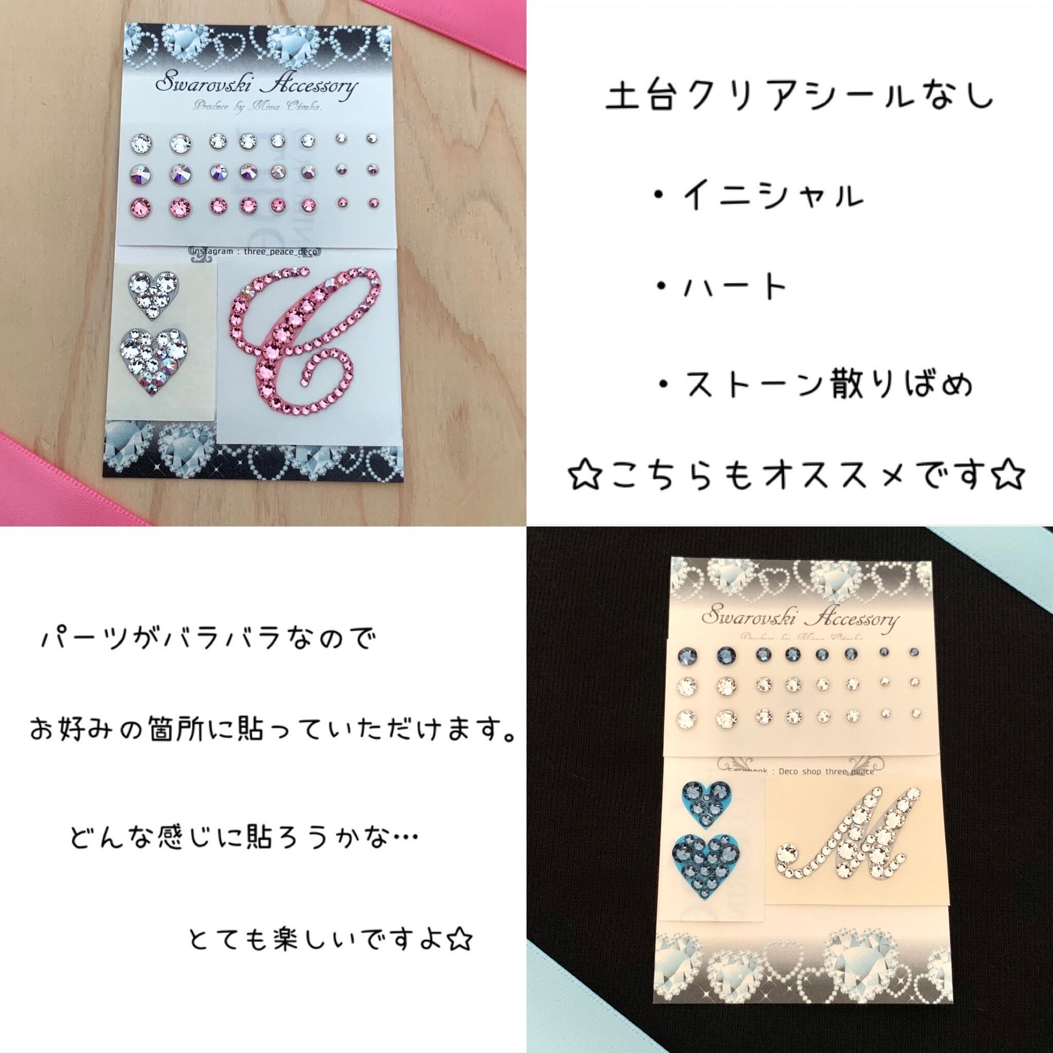 イニシャルの周りにスワロフスキーを散りばめたデザイン、ハート2個はお好きな箇所に貼っていただけます。