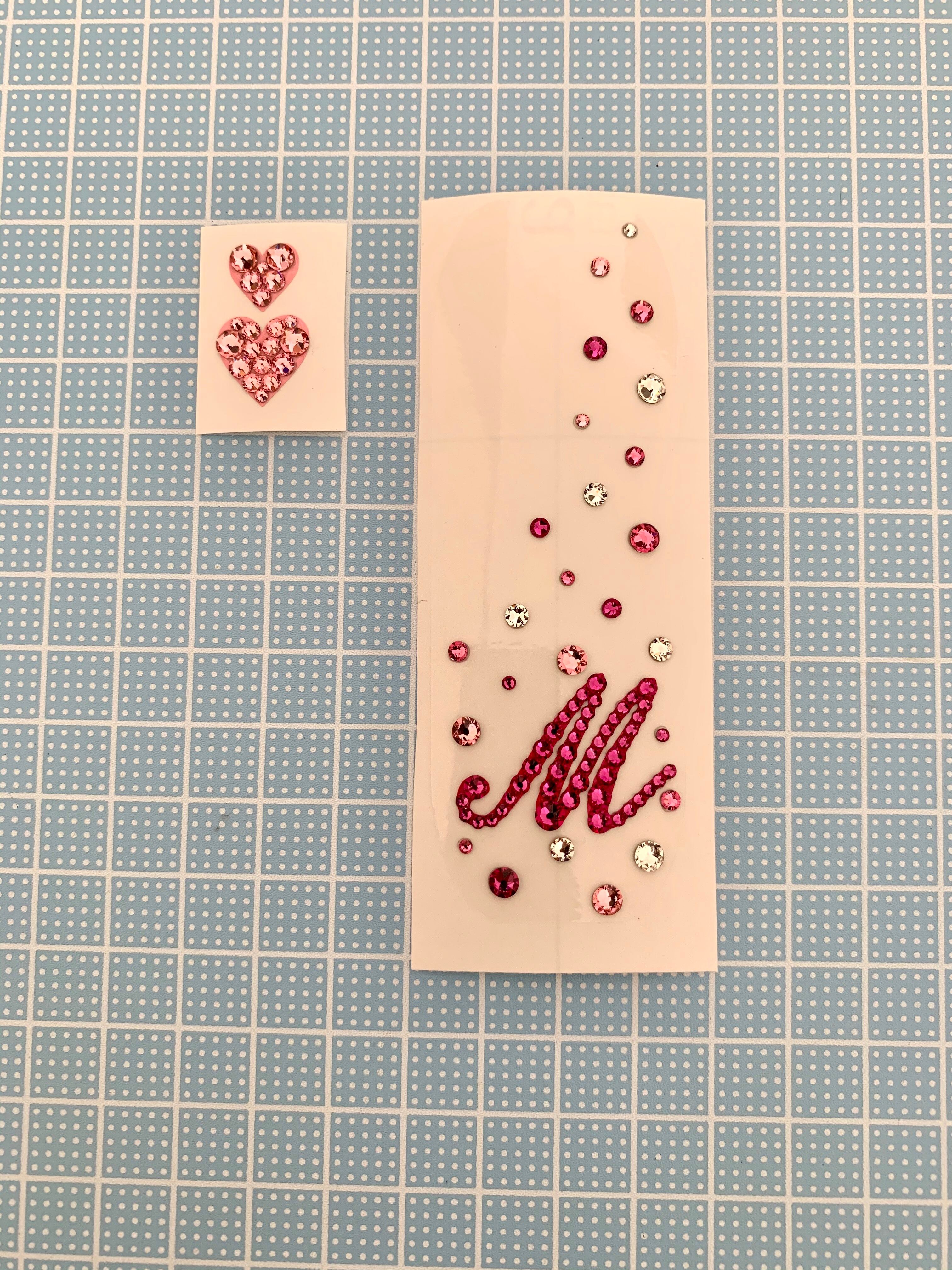 イニシャルの周りにスワロフスキーを散りばめたデザイン、ハート2個はお好きな箇所に貼っていただけます。